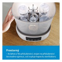 PROSTORNÝ - Sterilizace a sušení pro 4 ks lahví a 10 ks příslušenství, jako jsou savičky, dudlíky, apod. Stojan na příslušenství lze snadno vyjmout, což zvyšuje kapacitu sterilizátoru.