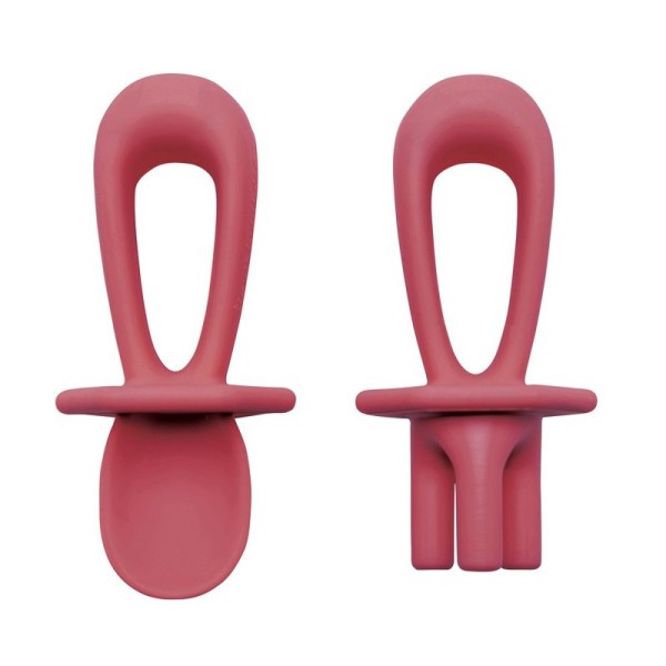 Silikonové lžička a vidlička pro batolata, vyrobené z 100% potravinářského silikonu. Odolné, hygienické, šetrné k dásním a navržené pro malé ruce. Bezpečný tvar zamezuje riziku udušení. Pro děti od 6 měsíců.