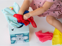 Originální box s otvorem, naplněný textilními šátky, zajistí dětem zábavu na dlouhé hodiny a podpoří jejich smysly i jemnou motoriku.
