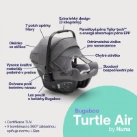 Nová autosedačka Bugaboo Turtle Air by Nuna zajistí zcela bezpečnou, plynulou a pohodlnou jízdu. Za pomoci adaptérů ji lze lehce nacvaknout na kočárek. Váží pouhé 3 kg, a tak se snadno přenáší.