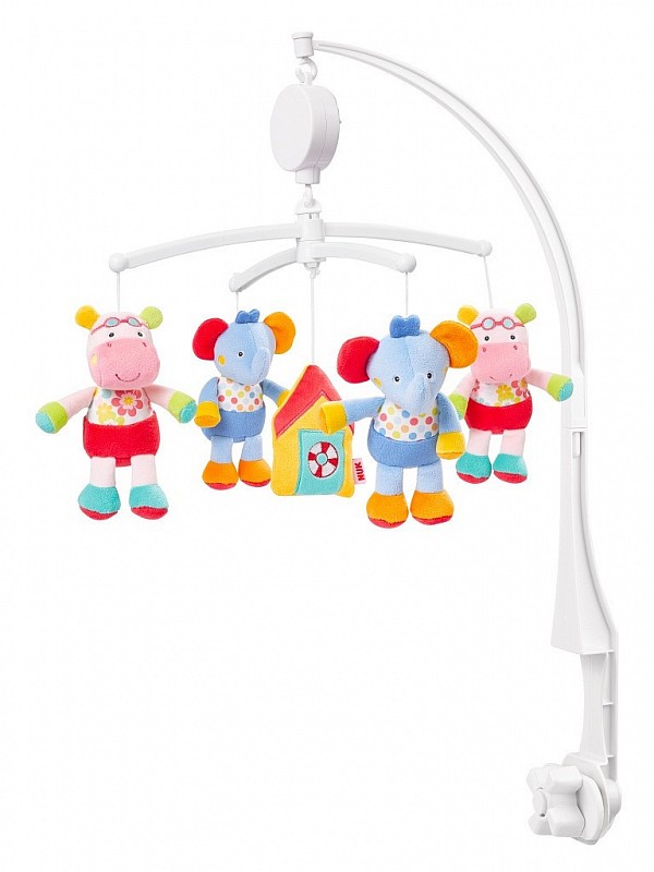 Hudební kolotoč má zavěšené plyšové hračky s motivy hrošíka a sloníka. Hrací kolotoč napomáhá vašemu děťátku v klidu usnout. Veselé barvy a příjemná melodie zklidní miminko před spaním. Kolotoč snadno připevníte ke konstrukci postýlky.