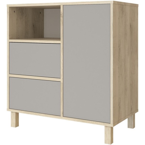 • Úložný prostor: Na levé straně komody 1 dvířka a police, na pravé straně 2 zásuvky a 1 otevřená police.