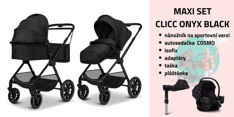 Sada CLICC MAXI obsahuje hlubokou vanu, sportovní korbičku, podvozek, autosedačku COSMO Black s Isofix, fusak-nánožník, přebalovací tašku v barvě kočárku, pláštěnku a adaptéry na autosedačku. SKLADEM POSLEDNÍ KUS Z PRODEJNY.